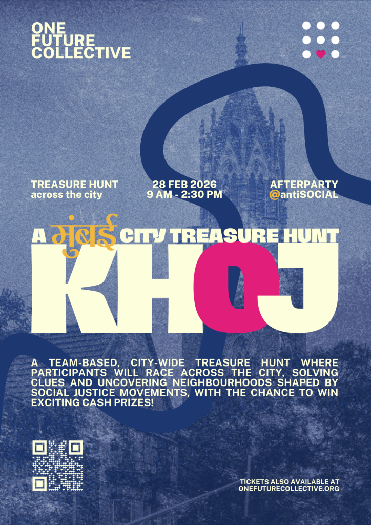Khoj Mumbai is a team-based, citywide treasure hunt happening on 28th February, 2026, from 9:00 AM to 11:00 AM, where participants will race across the city, solving clues and uncovering neighbourhoods shaped by social justice movements, with the chance to win exciting cash prizes. An afterparty at antiSOCIAL, Lower Parel, will follow the hunt, from 11:30 AM to 2:30 PM to celebrate our wins! You can sign up here: https://pages.razorpay.com/OFCTreasureHunt