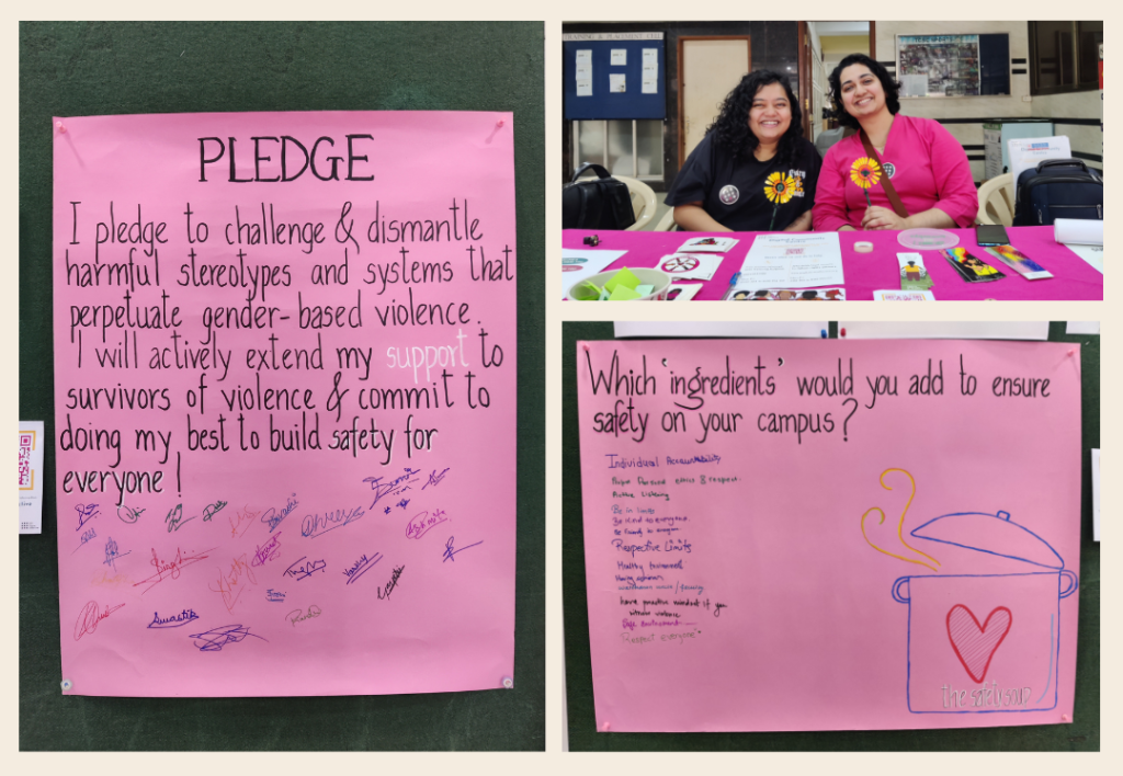 Over 50 students interacted with us at the booth, engaging in thoughtful dialogues on building trauma-informed campus ecosystems. Activities like Safety Soup—a symbolic recipe for campus safety and healing—encouraged students to envision the ingredients of safer spaces; and Prompts ka Dabba invited self-reflection on fostering care for oneself and others; while Our Pledge encouraged personal commitment to trauma-informed care. A highlight was the narrative simulation game, The Upstander Effect (linked above!), where participants role-played as bystanders intervening in instances of gender-based violence. Faculty members also engaged with booth activities and accessed our online resource book, Planting Dandelions: Supporting Survivors of Sexual and Gender-Based Violence. This initiative underscored the systemic changes needed in educational spaces—shifting from a culture of blame and neglect to one of care and accountability. Together, the booth created a collaborative space for students and educators to reimagine campuses as safe and just environments, where survivor well-being is a priority.