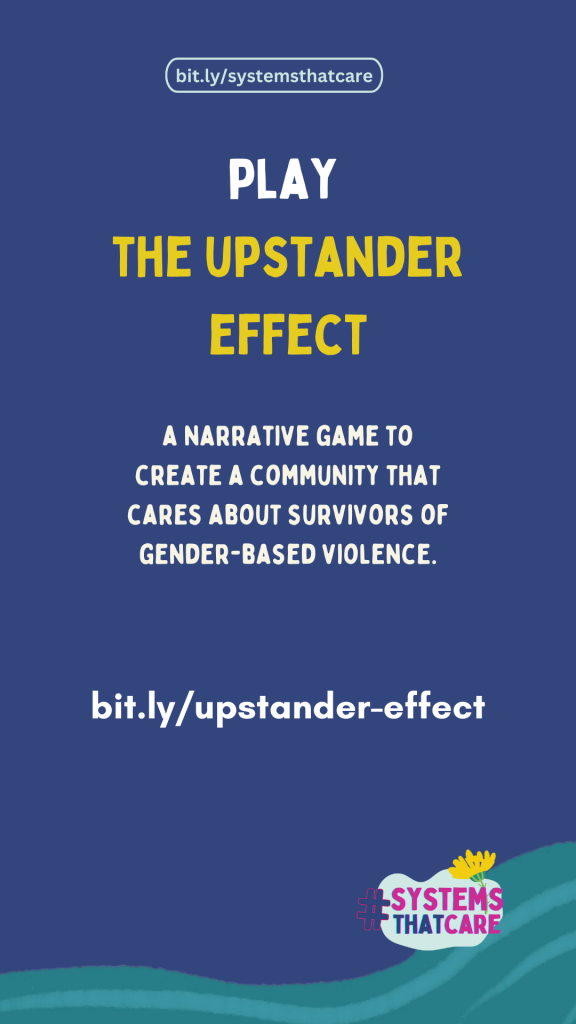 The Upstander Effect is a narrative simulation game that trains users on bystander intervention. In this immersive game, you roleplay as someone witnessing an act of gender-based violence happen in front of you. Through the game, you will learn what tactics work and what don’t in these situations.