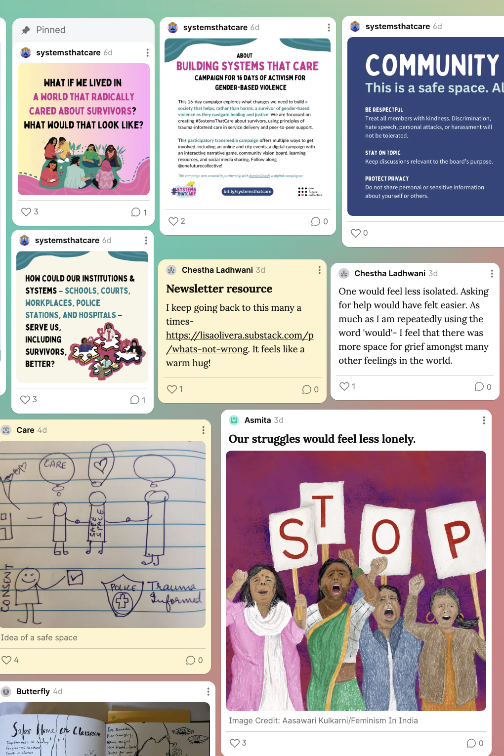 This question kicked off our campaign through an online Community Healing Space, facilitated by Vaishali Singha, where participants doodled their visions of such a world. One participant remarked how the prompts stuck with them, especially as they reflected on how institutions could truly serve survivors. They noted how these reflections would shape their work with children, underscoring the importance of spaces like this for sparking lasting change. Art, conversation, and care—this space was a little step toward re-envisioning our systems.